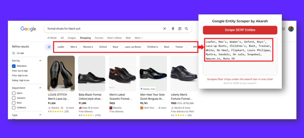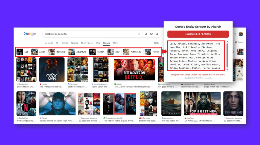 This Chrome extension is built for entity extraction and entity-based SEO workflows. Instead of manually guessing which attributes, subtopics, or concepts to include, you can extract them straight from Google’s refinement data and map them into your content and marketing strategy.